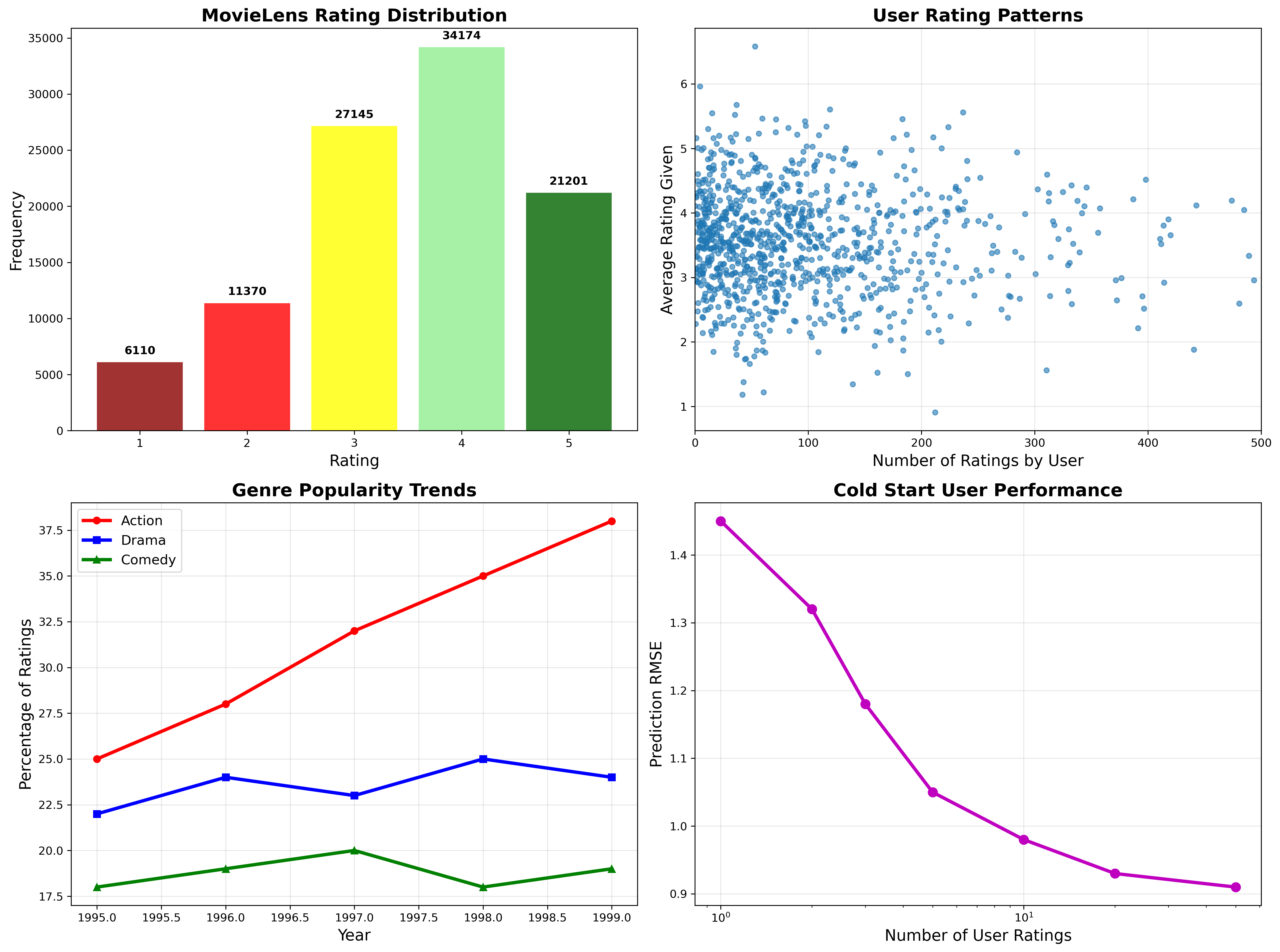 User Behavior Patterns: Rating distribution skews positive. Cold start performance improves rapidly with just 5 initial ratings.
