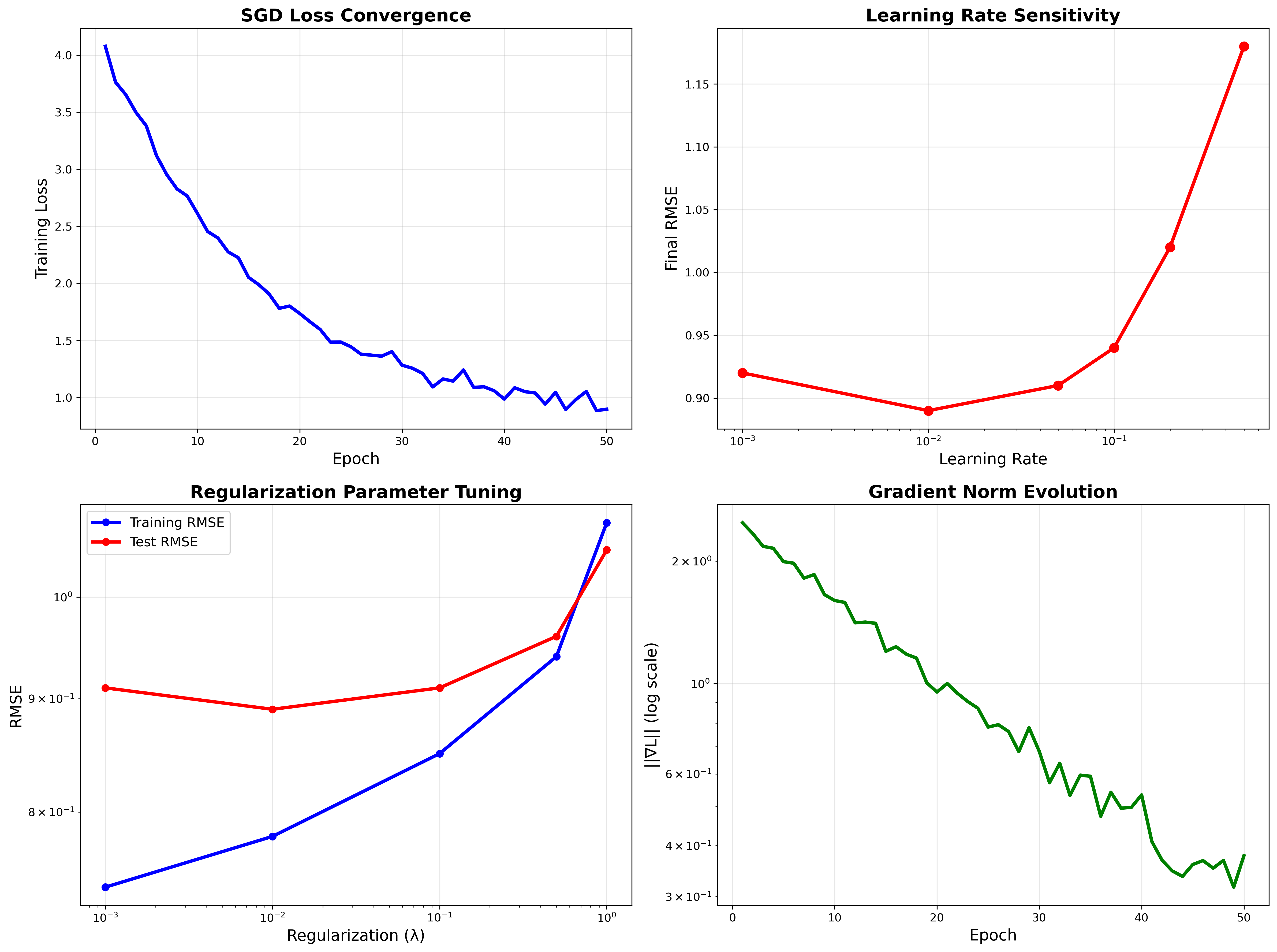 SGD Optimization: Loss converges rapidly in 20 epochs. Optimal learning rate α=0.01, regularization λ=0.1 prevents overfitting to sparse patterns.