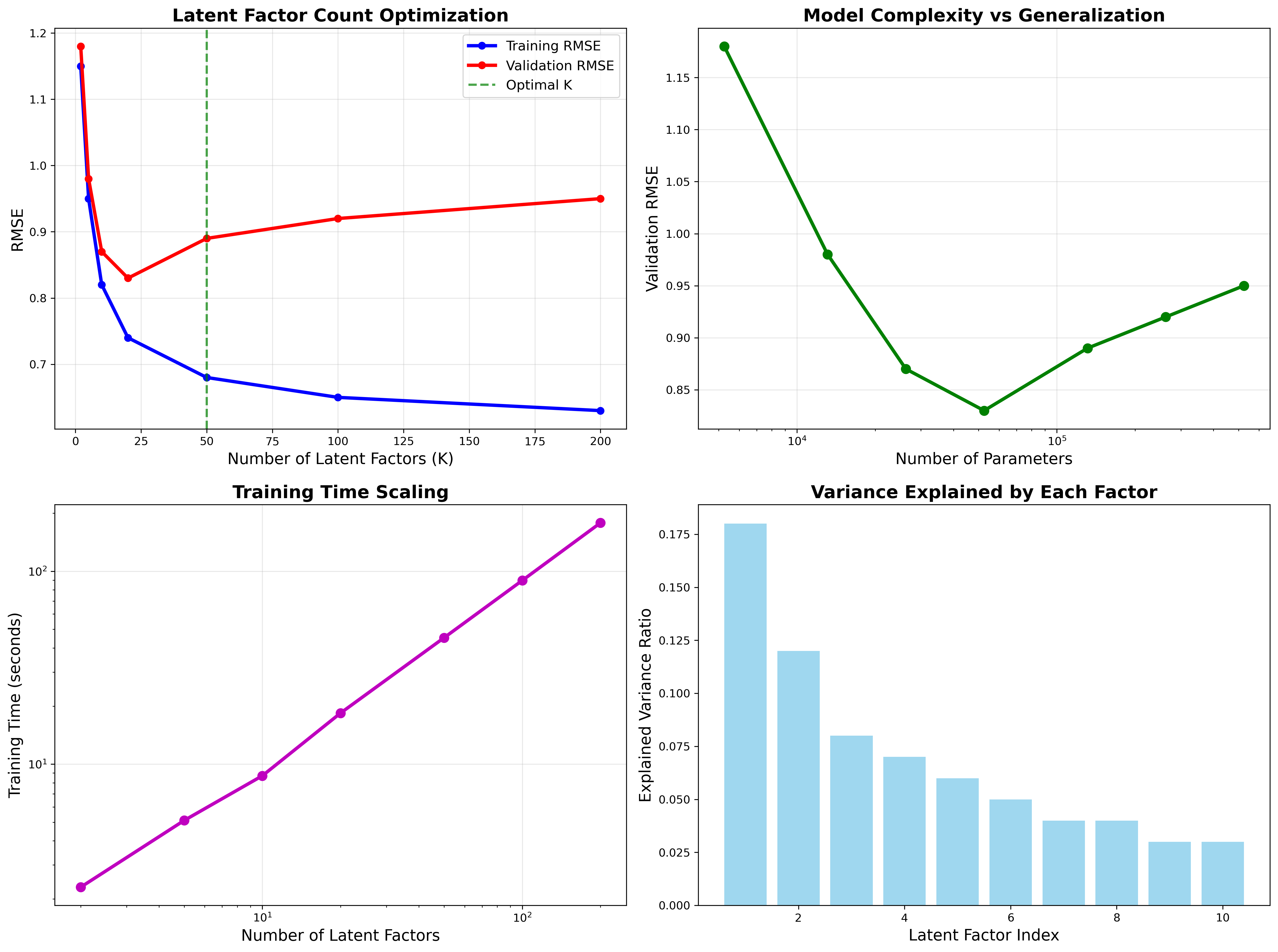 Latent Factor Analysis: K=50 factors optimal — fewer underfit complex preferences, more overfit to training sparsity. Training time scales linearly with dimensionality.