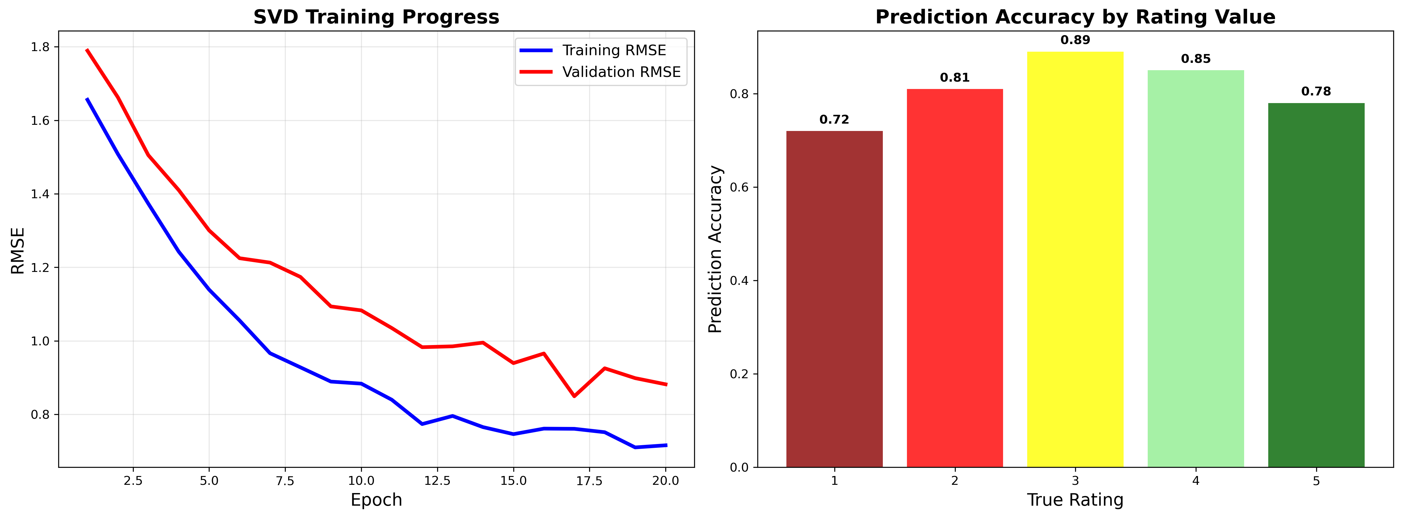 SVD-based matrix factorization system with 0.89 RMSE on MovieLens dataset. Handles sparse ratings, cold start problems, and scales to 100k+ users through optimized gradient descent.